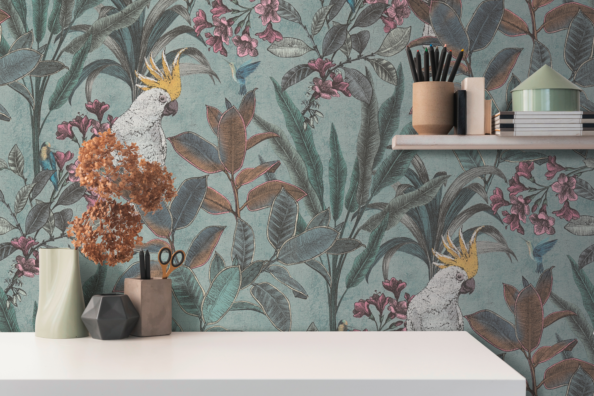 Flourish består av både ensfargede tapeter og mønstre, der mønstrene er rike på naturmotiver. Vi finner motiver av både fiskene i havet og skyene oppe i himmelen. I tillegg byr Flourish på ulike blomstermotiv, frisk grønn natur og tropiske innspill.