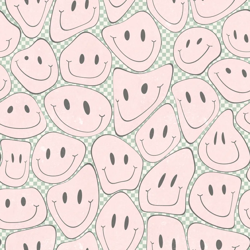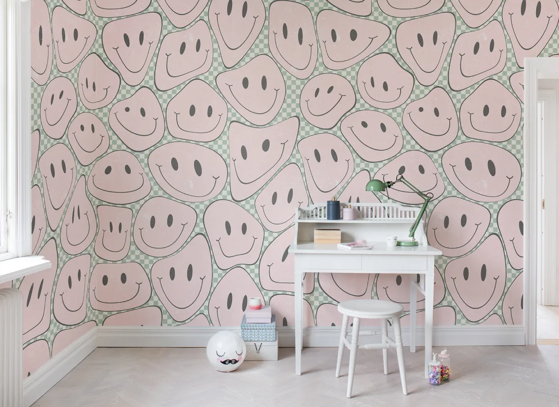 Sett et smil på veggen med disse fargerike og lekne ansiktene. 90-tallsnostalgi på sitt beste! Husk at det er kult å være snill! Denne designen gir en moderne versjon av de ikoniske smileysene. Mønsteret er stort, og ansiktene er alle forskjellige, men vennlige. Overflaten gir et steinlignende inntrykk. Sjakkfargebanen har et ekstra grafisk utseende takket være den rutete bakgrunnen. Gå all in!