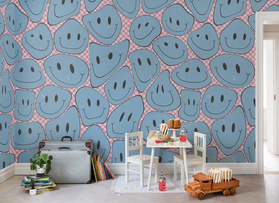 Sett et smil på veggen med disse fargerike og lekne ansiktene. 90-tallsnostalgi på sitt beste! Husk at det er kult å være snill! Denne designen gir en moderne versjon av de ikoniske smileysene. Mønsteret er stort, og ansiktene er alle forskjellige, men vennlige. Overflaten gir et steinlignende inntrykk. Sjakkfargebanen har et ekstra grafisk utseende takket være den rutete bakgrunnen. Gå all in!