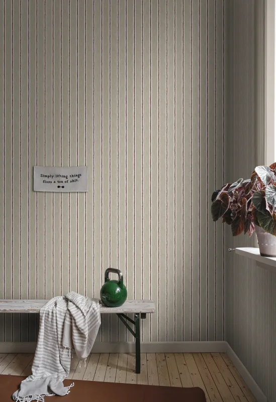 Med håndtegnede stripemønstre inspirert av utviskede pastellfargestifter gir tapetet Albin et lekent og levende preg til ethvert rom. De beige og dempede rustfargene gir en subtil, men likevel livlig stripe som uanstrengt gir liv til veggene med sin kreative karakter.