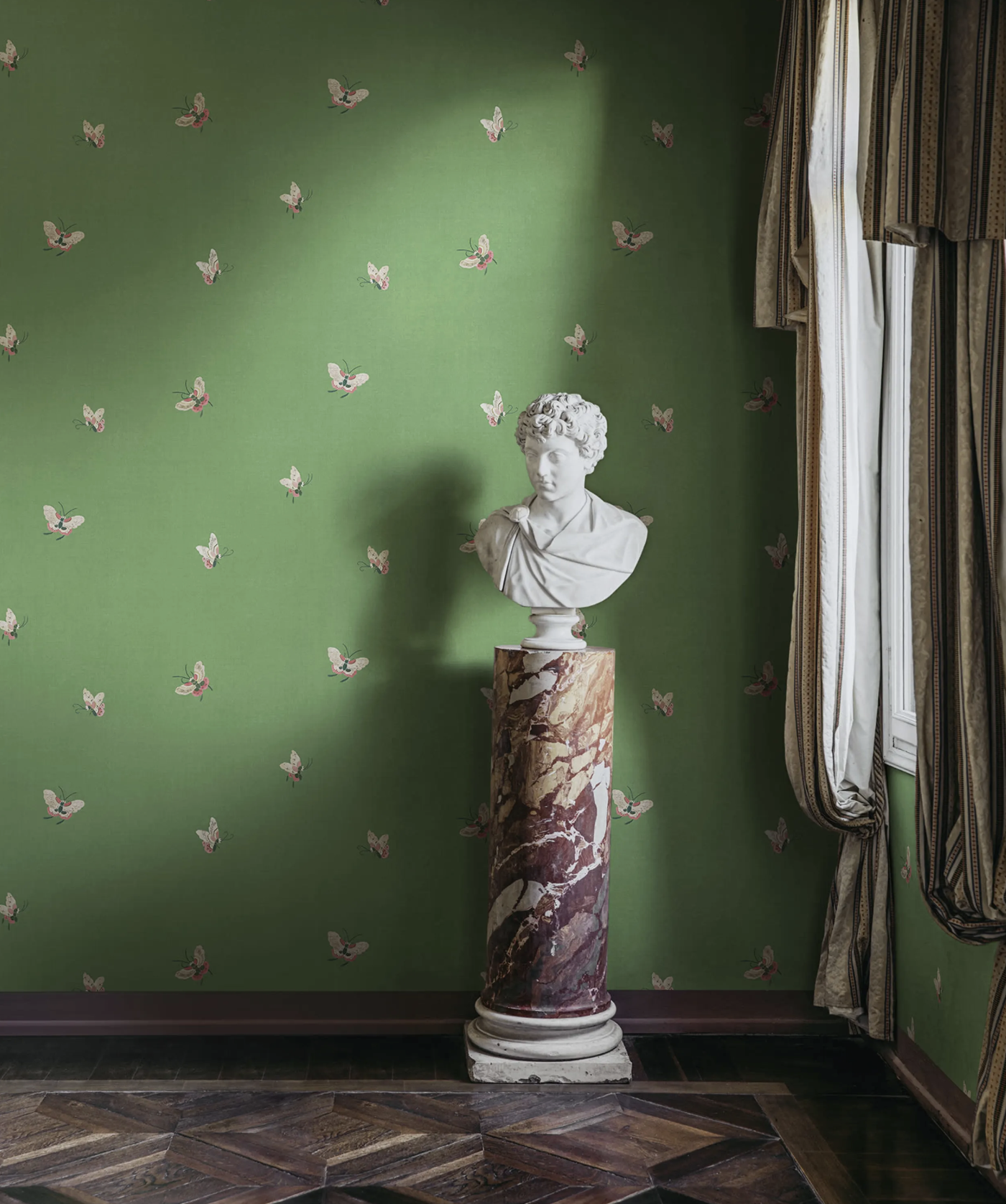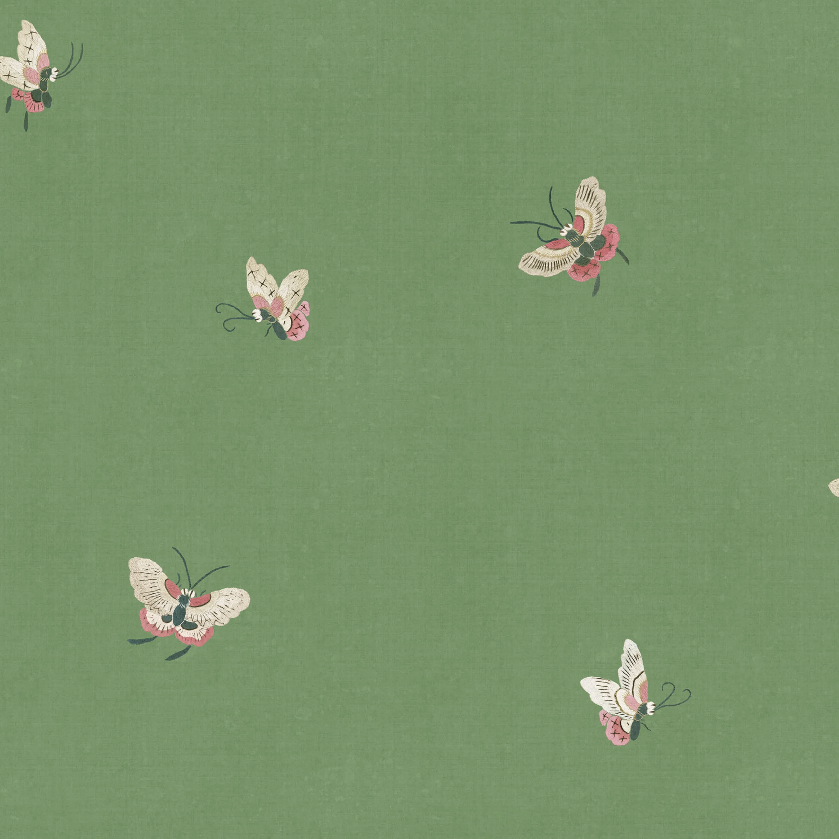 Med vektløse vinger svever de små, søte sommerfuglene over tekstiloverflaten, og bringer harmoni til rommet. Designet er inspirert av et nydelig kinesisk silkestoff fra 1800-tallet. Sommerfugler, grønn, har en levende grønn base og søte flygende sommerfugler i hvite, røde og rosa nyanser.