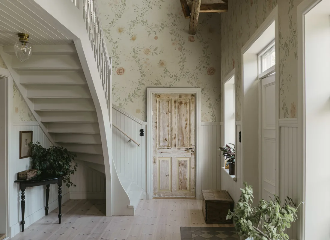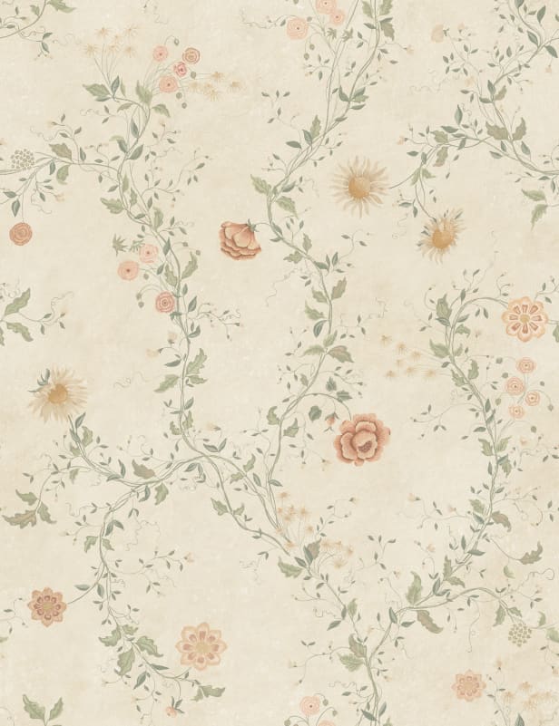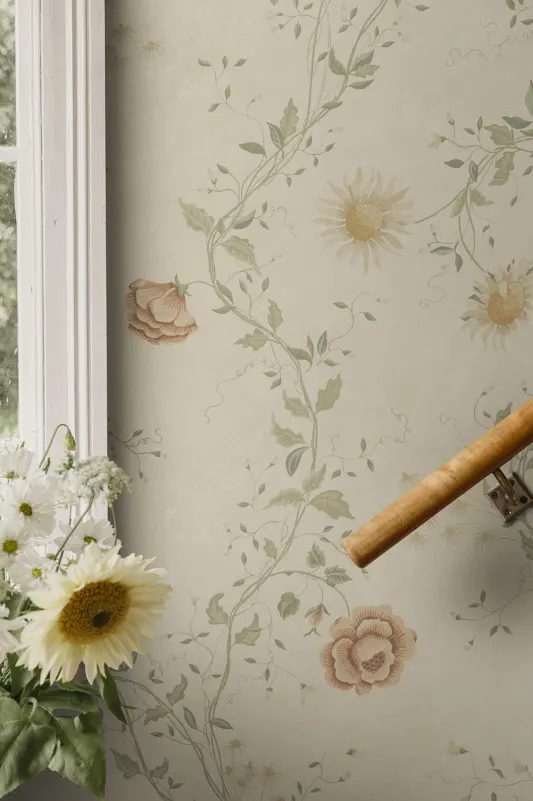 En delikat håndmalt blomstersymfoni laget i samarbeid med @snickarglädjen inneholder noen av hennes hagefavoritter. Solsikker, georginer, treasters og søte erter fletter seg sammen mot en forvitret rå steinoverflate, og skaper et vakkert moderne vintage-utseende. Inger, Brown, er kledd i vakre nyanser av brunt, grønt, mykt rosa, dempet gult og hvitt