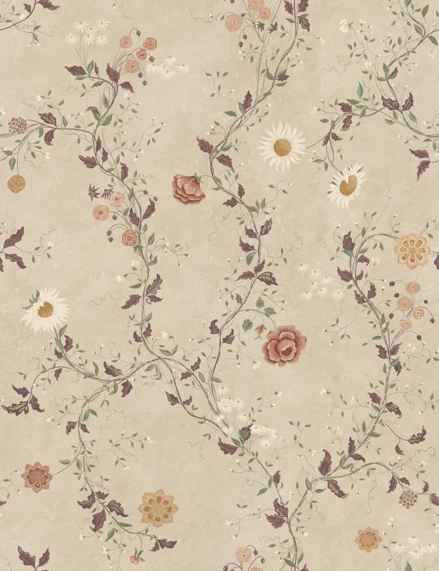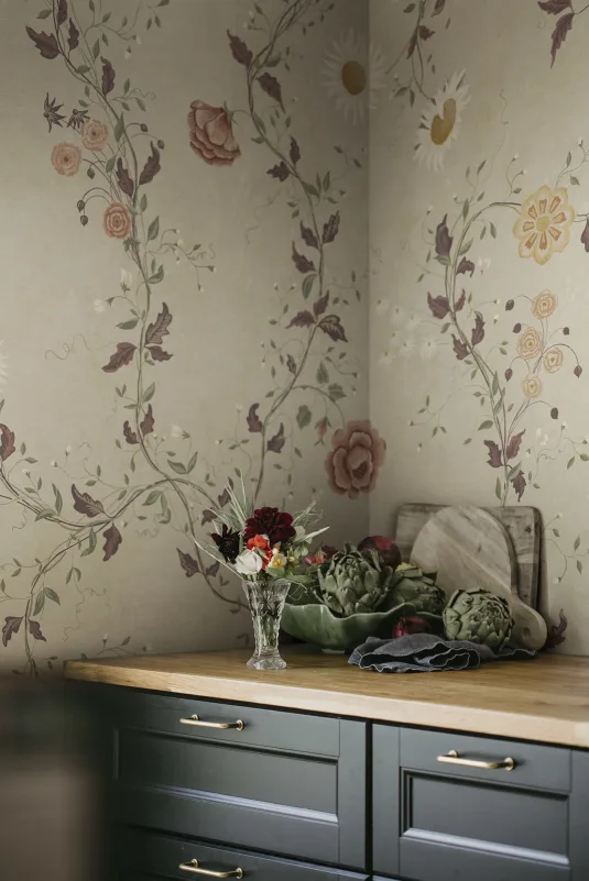 En delikat håndmalt blomstersymfoni laget i samarbeid med @snickarglädjen inneholder noen av hennes hagefavoritter. Solsikker, georginer, treasters og søte erter fletter seg sammen mot en forvitret rå steinoverflate, og skaper et vakkert moderne vintage-utseende. Sandstone-fargevalget kommer i varme nyanser av beige, grønt, rødt, hvitt og gult.