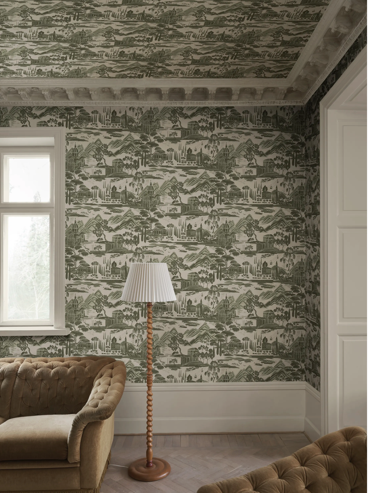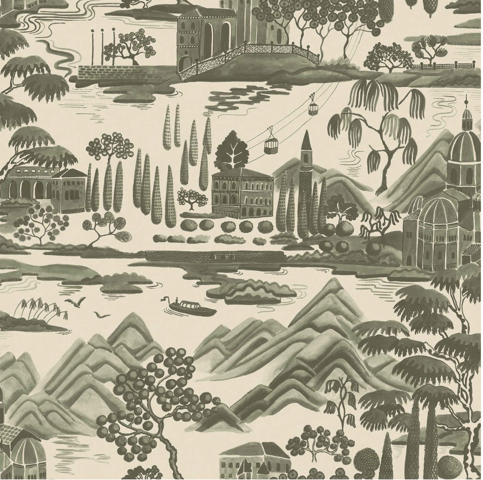 Opplev den rolige sjarmen til Comosjøen med denne skoggrønne toileen som viser naturskjønne fjell, ikonisk arkitektur og frodig løvverk. Dette mønsteret legemliggjør elegansen og mystikken i det fortryllende italienske landskapet, og blander tradisjon med tidløs skjønnhet.