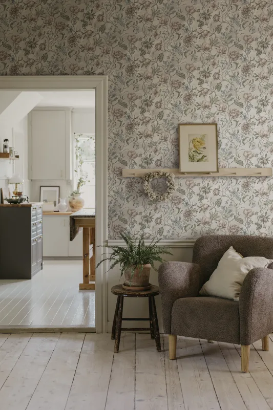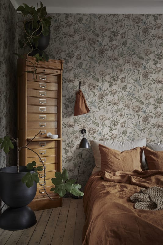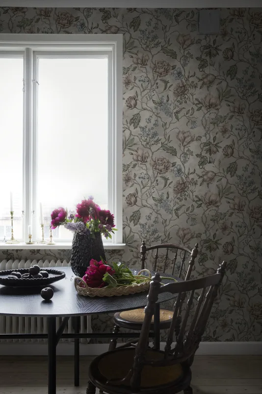 Kolonin er vår tolkning av livet som foregår mellom hjemmet i byen og besøket på parsellen. Håndmalte blomsterstilker og praktfullt bladverk samhandler i en boblende flora, fargevalget gjenspeiler moderne tider og spenner fra det behagelig nøkterne til det dramatisk mørke.