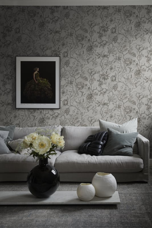 Kolonin er vår tolkning av livet som foregår mellom hjemmet i byen og besøket på parsellen. Håndmalte blomsterstilker og praktfullt bladverk samhandler i en boblende flora, fargevalget gjenspeiler moderne tider og spenner fra det behagelig nøkterne til det dramatisk mørke.