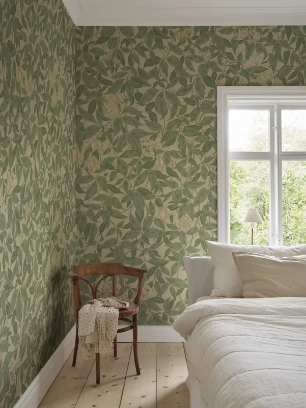 Trå inn i en hage der klematis og kaprifol svaier forsiktig i brisen og skaper en rolig scene som beroliger sjelen. Linnea Mural, Green er et velbalansert blomstermaleri, tegnet for hånd og malt med en myk palett inspirert av svenske sommerhager i full blomst. Det inviterer ro og harmoni inn i rommet ditt, og tilbyr et rolig bakteppe for både hvile og refleksjon.