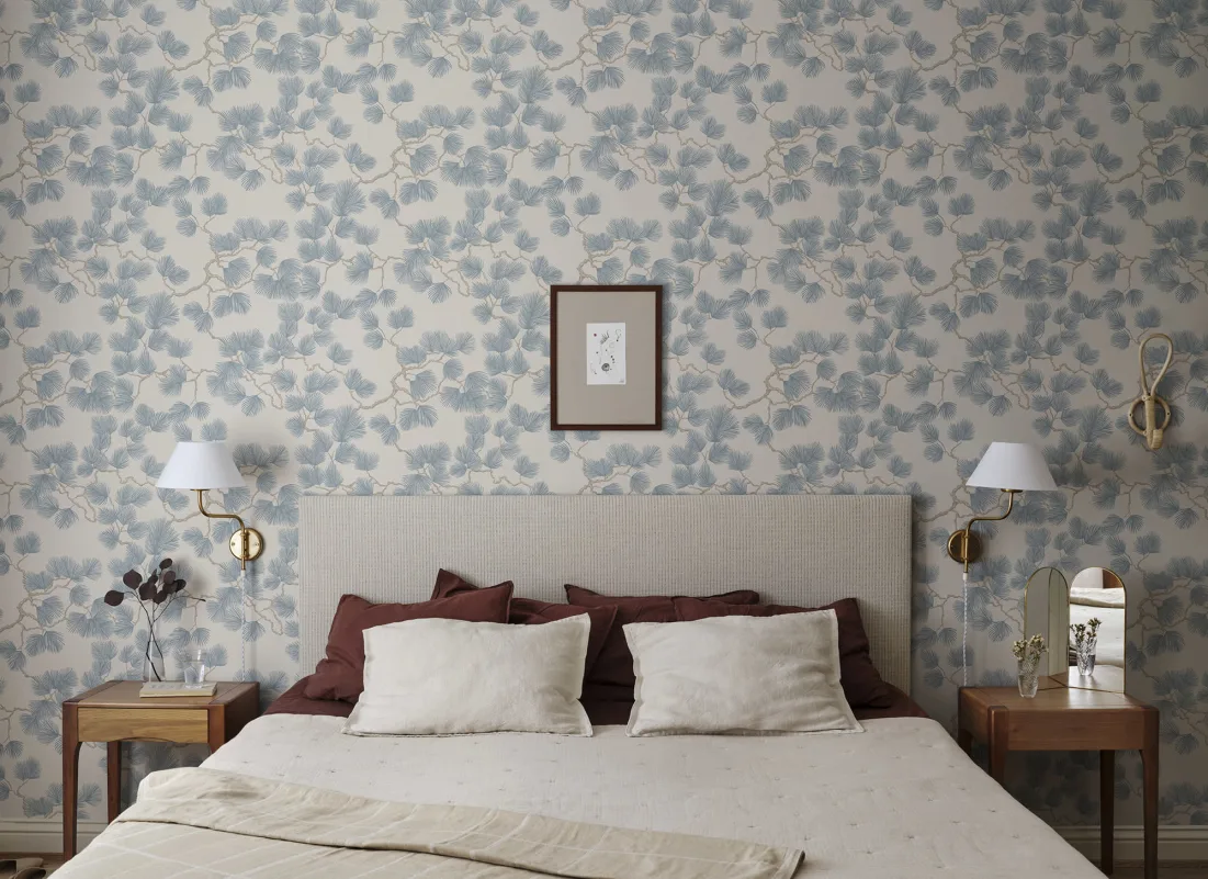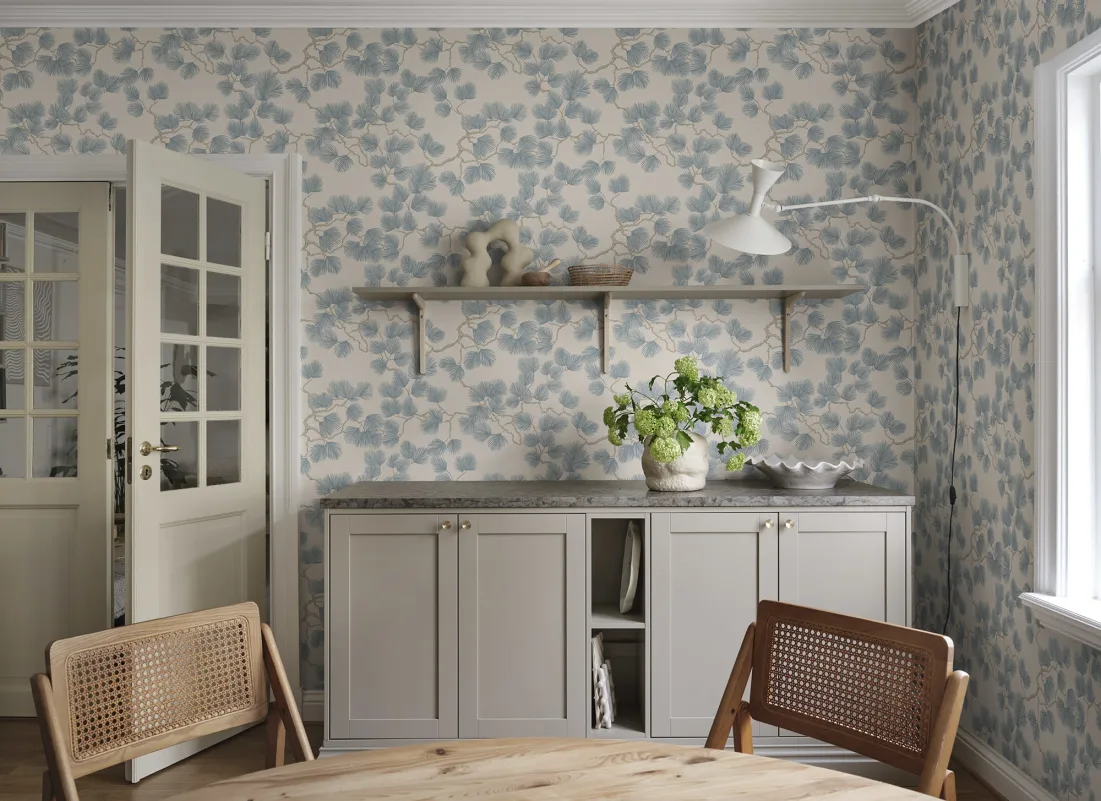 Vår elskede tapet Furu i nordiske omgivelser. Treet står høyt gjennom århundrer og holder seg grønt hele året med sine blondefjær, til tross for bitter kulde og snø. Grenene dekker veggen i en lett, stormønstret dans. Levende, men likevel rolig. Fargevarianten Misty Blue kommer i en lys tåkeblått på en beige bakgrunn.