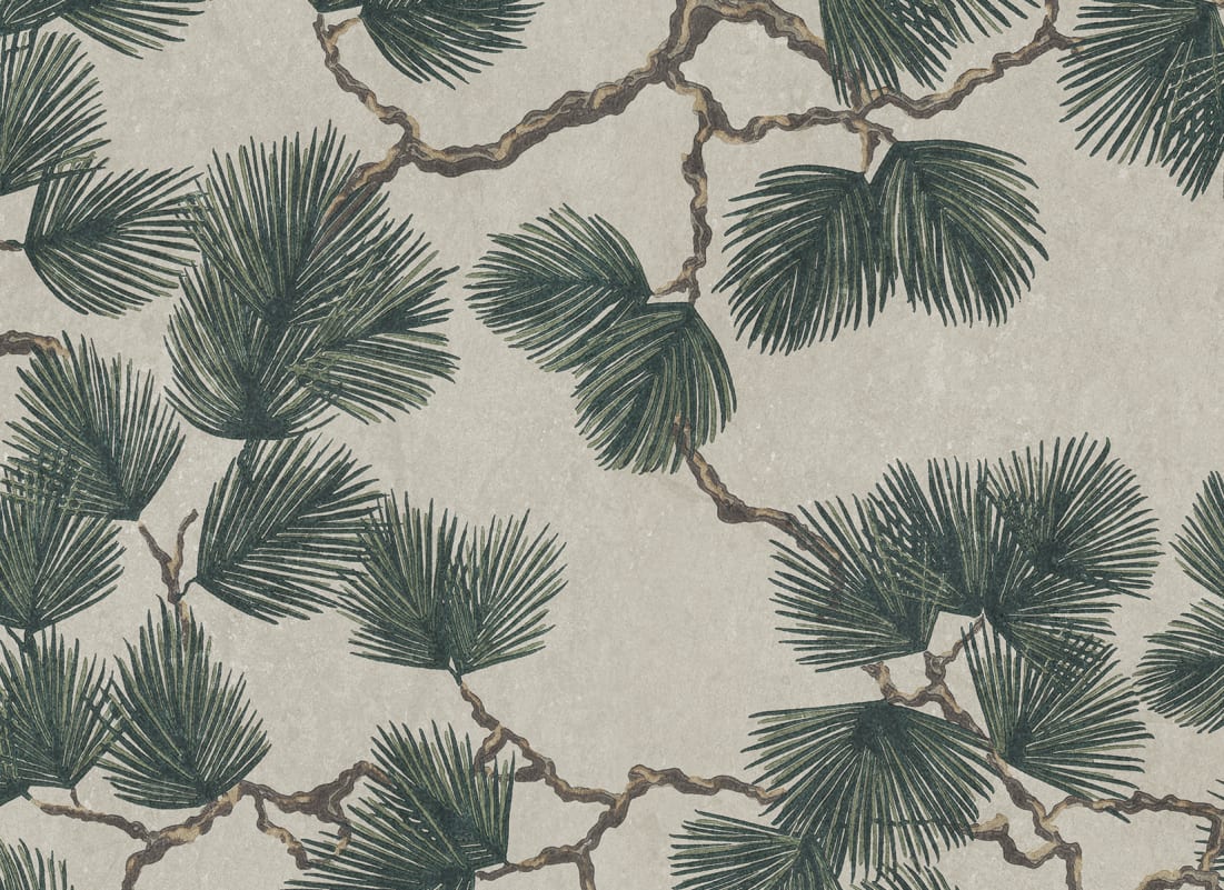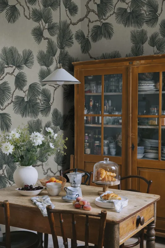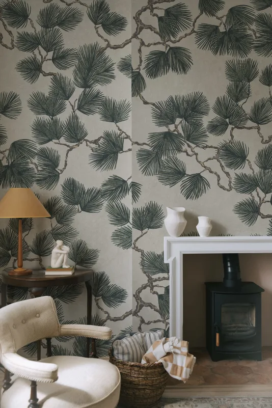Vindblåste furutrær står stolt i grupper nær kystengene på Öland. Pine Mural er en forstørret versjon av vårt elskede mønster Pine, hvor grenene med fjæraktige nåler dekker veggen i en lett, luftig dans. Livlig, men likevel rolig. Pine Mural, Green, har en varm grå base med brune greiner og frodige grønne nåler.