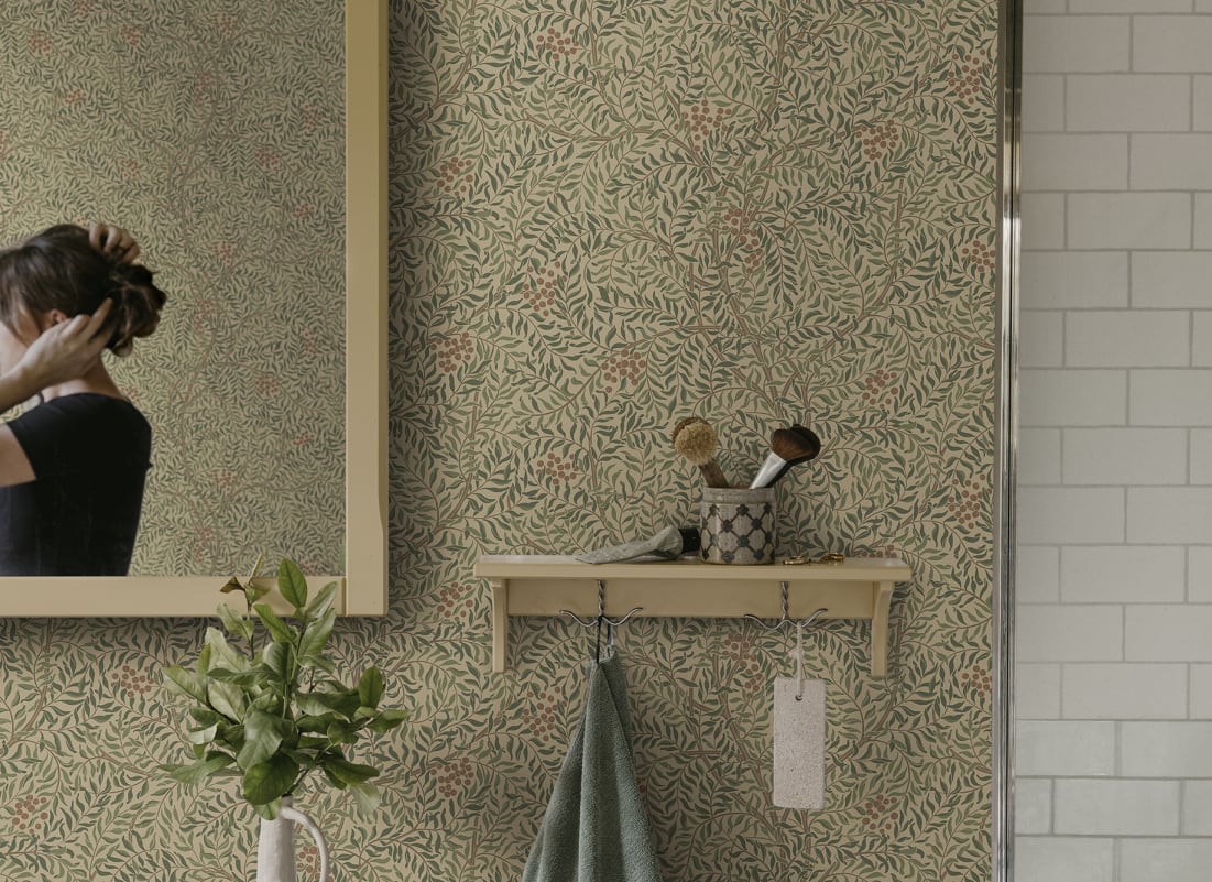 Et harmonisk overflatetrykt mønster med intrikate rognebærgrener skaper en koselig og innbydende atmosfære med sitt stiliserte og omsluttende design. Garden Green-fargeskjemaet har livlige toner av varm beige, brun, myk terrakotta og hagegrønne nyanser.