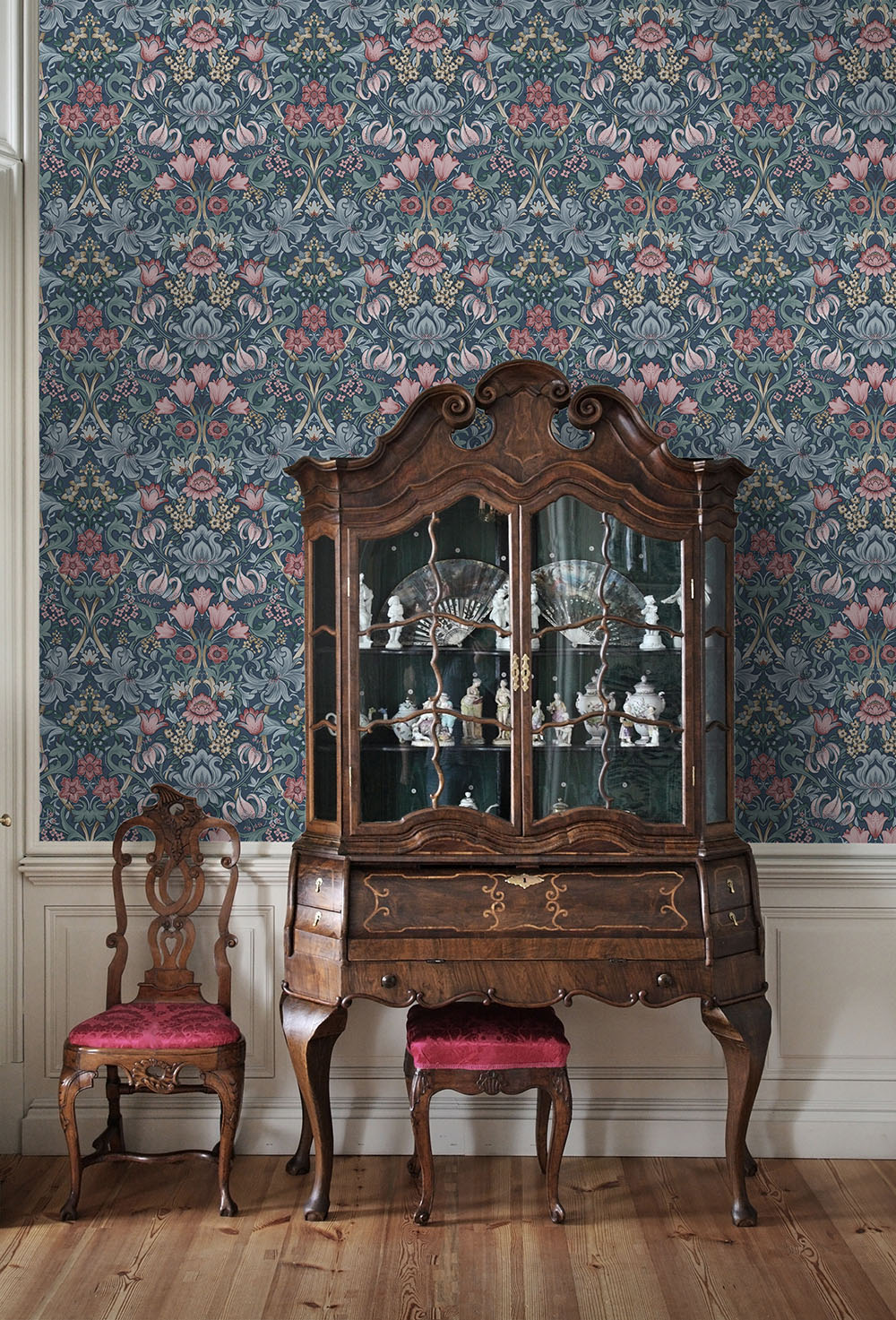 Fleurmont er et elegant blomstermønstret damasktapet med stiliserte blader og slyngende ranker. De speilvendte, organiske formene skaper en tidløs eleganse som gjentas over hele tapetet. Resultatet er et sofistikert uttrykk som balanserer luksus og harmoni – perfekt for rom der du ønsker en klassisk og raffinert atmosfære.