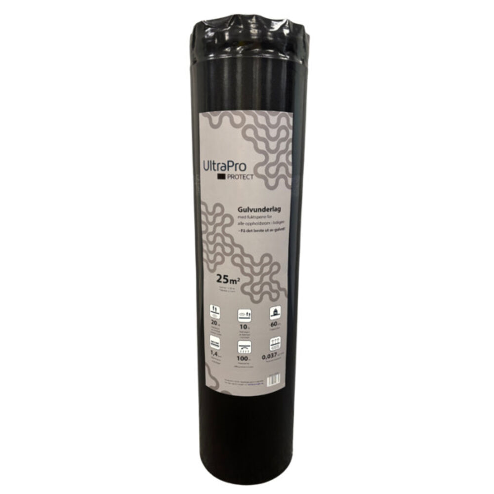 Dette underlaget med en densitet på hele 100 kg/m3 er et trygt og godt valg ved flytende installasjon av parkett, laminat og andre trebaserte gulv på undergulv av betong/lettbetong eller mur. Leveres med integrert fuktsperre og tape. Samtlige egenskaper overgår kravene i henhold til EN 16354 og underlaget er beregnet for å benyttes i alle typer oppholdsrom, også stue, kjøkken og gangrom med høy trafikk. UltraPro Protect med fuktsperre har gode trinnlydsdempende egenskaper, gir god utjevning og leverer solid trykkfasthet under både statisk og dynamisk belastning. Godkjent for legging på gulv med gulvvarme. Produktet skal ikke støpes inn eller legges under vegg til vegg tepper eller andre «ikke trykkfaste» produkter.
